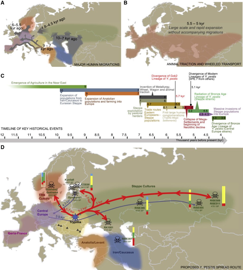 Avec une telle densité de population, combinée à la proximité avec des animaux, les méga-villages Cucuteni-Trypillia sont propices à la diffusion rapide de la maladie. Et dans une époque caractérisée par des échanges commerciaux longues distances favorisée par les innovations technologiques que sont les chariots tirés par des bœufs, la peste a pu se diffuser rapidement dans toute l’Europe. Tuant sur son passage, la peste affaiblit et réduit la population néolithique européenne. La nature reprend ses droits et les arbres regagnent du terrain sur les champs. (Allentoft, Sikora, Fischer, et al., 2024)